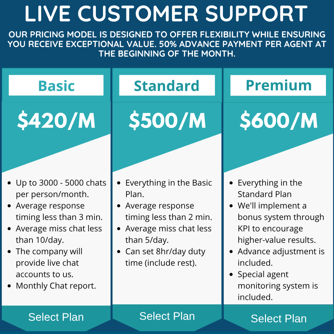 At SocoX, we are committed to elevating your customer experience through our Transparent Investment in Excellence pricing model, starting at $420/month. We care for your business by managing 3000-5000 chats per agent monthly, ensuring an average response time of less than 3 minutes and minimal missed chats, with the company providing live chat accounts for seamless integration. Our Standard plan enhances this with faster response times under 2 minutes and customizable 8-hour duty schedules, while the Premium plan introduces a KPI-based bonus system and advanced adjustment features, supported by a special agent monitoring system. With a 50% advance payment per agent at the month’s start, we prioritize your satisfaction with detailed monthly reports and dedicated support to drive your success.